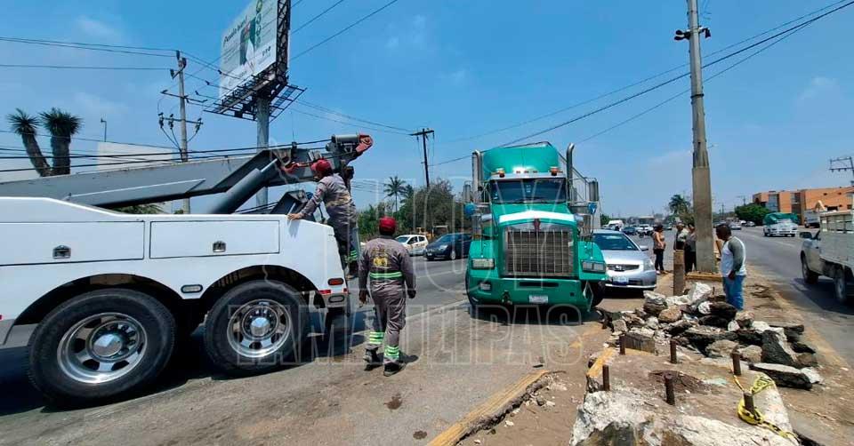Peritos de vialidad de Altamira encontraron sobre el pavimento una huella de frenado de aproximadamente a los 50 metros, lo cual deduce el exceso de velocidad con que circulaba el tráiler, cuyo propietario deberá responder por los daños materiales generados.