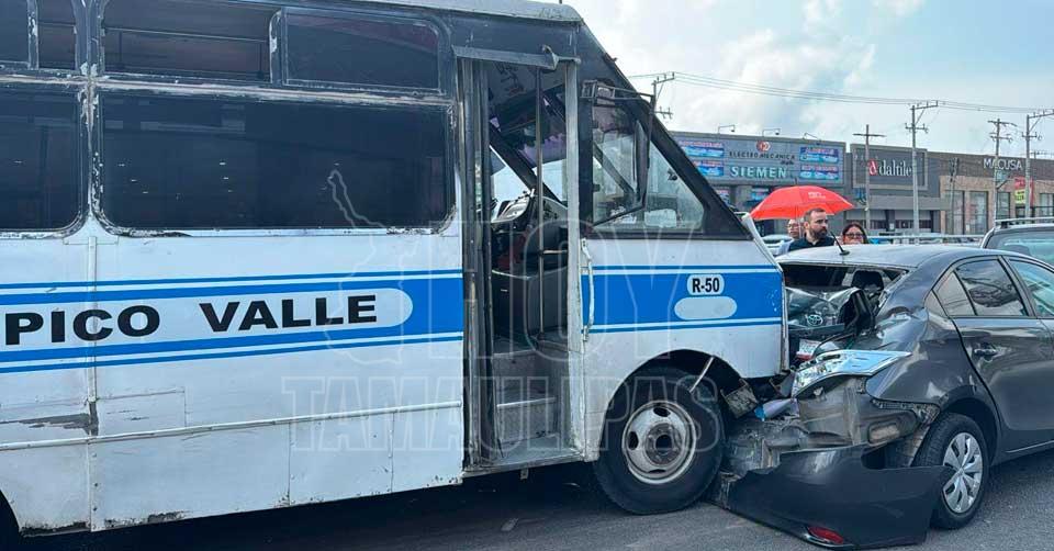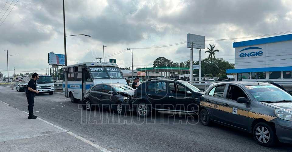Tampico, Tamaulipas. – El conductor de un microbús de la ruta Tampico-Valle por Avenida Hidalgo provocó un aparatoso choque múltiple al impactar por alcance a un automóvil, al cual proyectó contra un vehículo particular y este a su vez hacia un taxi en Tampico.
