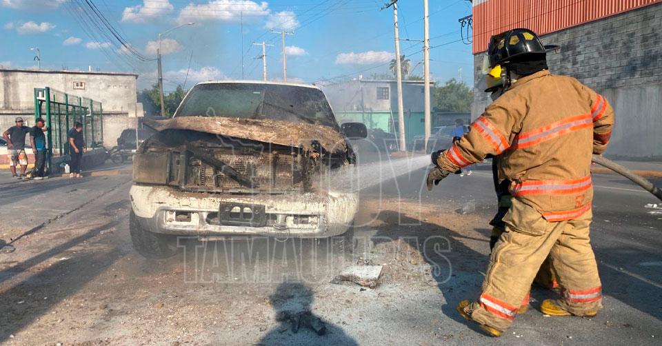 Nuevo Laredo, Tamaulipas. — Un incendio consumió por completo una camioneta Ford 250 en la colonia Palacios de Nuevo Laredo, presumiblemente debido a un cortocircuito en el motor.