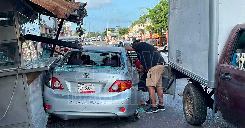 Tampico, Tamaulipas. - Dos mujeres y un hombre resultaron lesionados, al ser impactado el automóvil en el que viajaban por una camioneta, y proyectado contra un puesto de tacos y tortas.