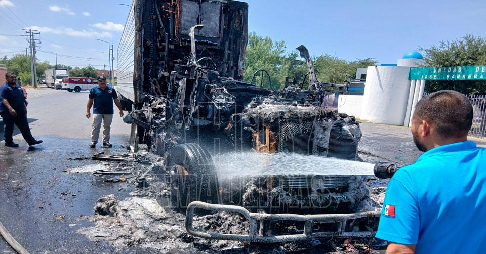 Miguel Alemán, Tamaulipas. – La cabina de un tráiler terminó reducida a chatarra tras incendiarse esta mañana frente a la Aduana de Miguel Alemán, dejando como saldo únicamente daños materiales.