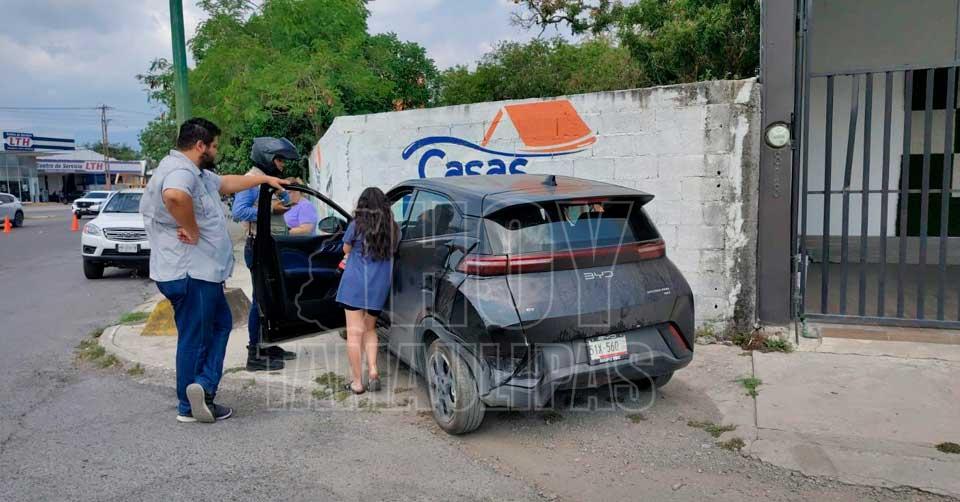 Jovencita provoca choque e impacta su BYD contra una barda en Victoria