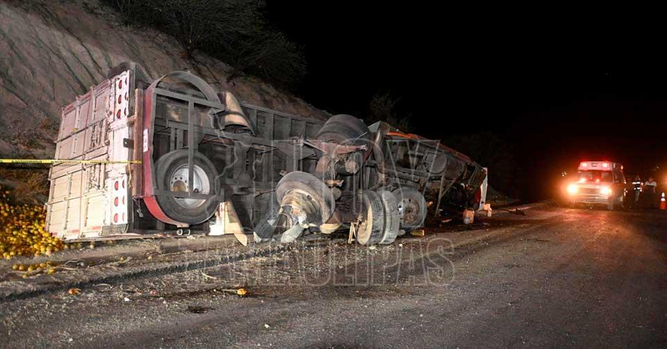 Jaumave, Tamaulipas. - Un accidente ocurrido la noche de este lunes en la carretera Rumbo Nuevo cobró la vida de un hombre que viajaba como copiloto en un tractocamión cargado con varias toneladas de naranjas, al quedar sepultado con la carga.