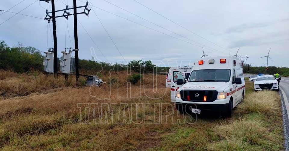 Llera, Tamaulipas. – Un accidente registrado en el kilómetro 181 de la carretera Victoria-Mante, antes de llegar a la cuesta de Llera, dejó como saldo dos personas lesionadas, luego de que una ambulancia de la Cruz Roja se impactara contra una torre que sostenía transformadores de la Comisión Federal de Electricidad (CFE).