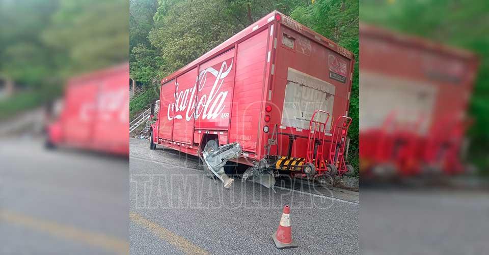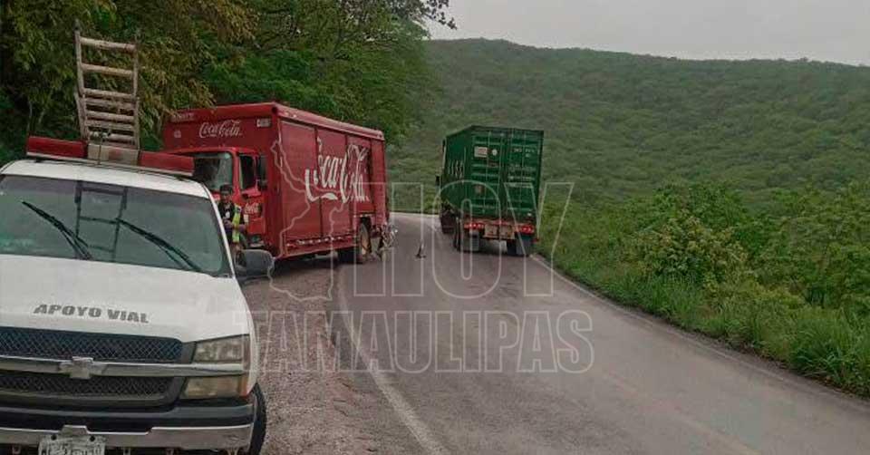 Antiguo Morelos, Tamaulipas. - Un camión de la empresa de paquetería Inbox cayó a un voladero tras chocar con un camión refresquero de Coca-Cola en el kilómetro 191 de la carretera Tampico-Barra de Navidad, cerca de Antiguo Morelos.
