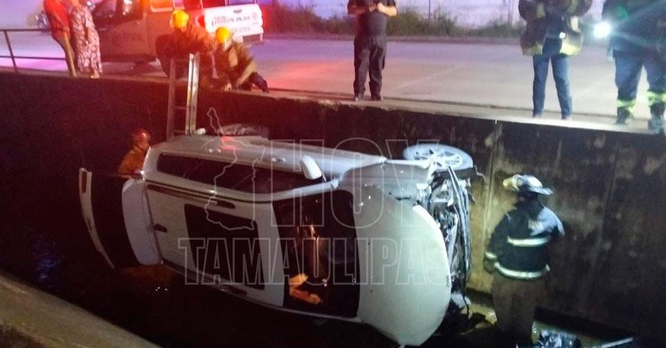 Ciudad Madero, Tamaulipas. - Una camioneta todo-terreno terminó volcada sobre su costado derecho al fondo del canal a cielo abierto ubicado en el acceso al Fraccionamiento 18 de Marzo en Madero, resultando sus ocupantes con algunos golpes y lesiones menores.