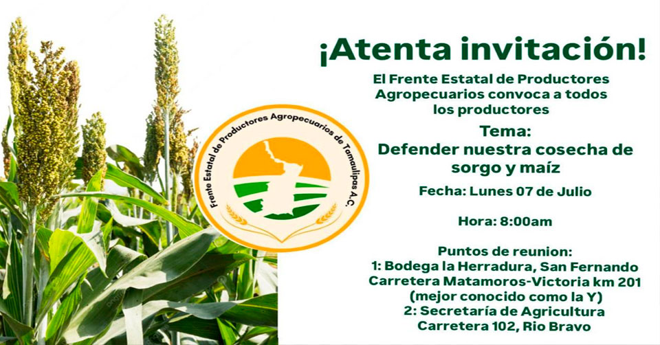 “Por eso la organización agrícola convocó a estas manifestaciones en la ‘Y’ y frente a las oficinas de la SADER en Río Bravo bajo el tema: Defender nuestra cosecha de sorgo y maíz”.