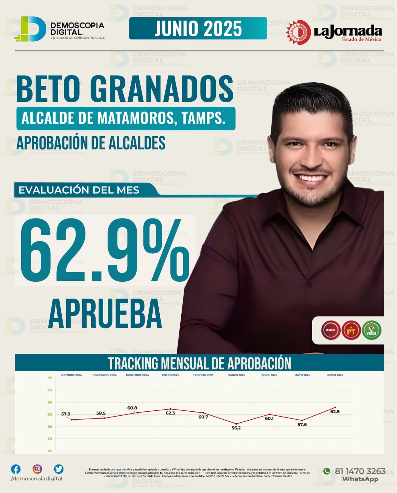 Matamoros, Tamaulipas. - En el más reciente estudio de la encuestadora Demoscopia, el alcalde de Matamoros Beto Granados, ocupa el 1er. lugar de aprobación ciudadana en el estado de Tamaulipas con un porcentaje de 62.9%.