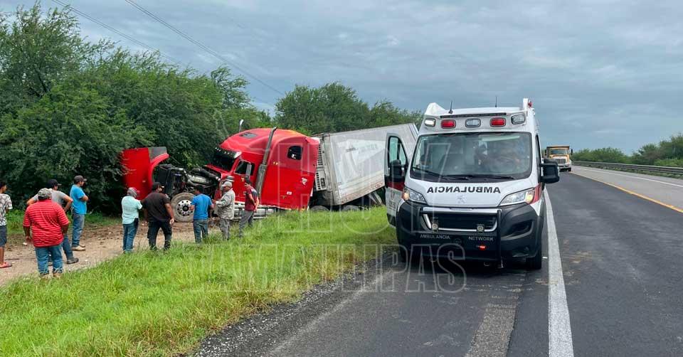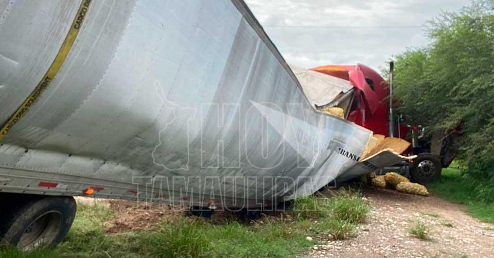 Villa de Casas, Tamaulipas. - Un tráiler que transportaba 30 toneladas de papa se salió de la carretera y chocó con un dren a la altura del kilómetro 25 de la carretera Victoria–Zaragoza, luego de que el operador presuntamente se quedara dormido al volante.