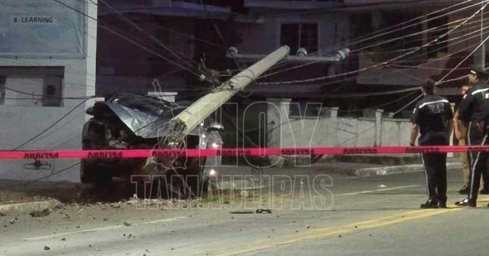 Tampico, Tamaulipas.-Con el frente destrozado terminó un automóvil, después de que su conductor se estrellara contra un poste de concreto de la Comisión Federal de Electricidad que fue derribado.