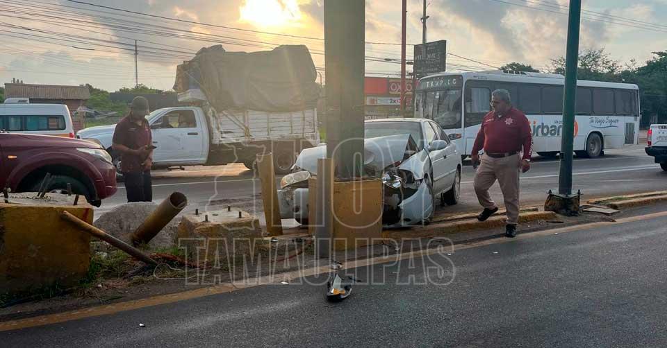 Auto “chocolate” choca contra base de semáforo en Altamira