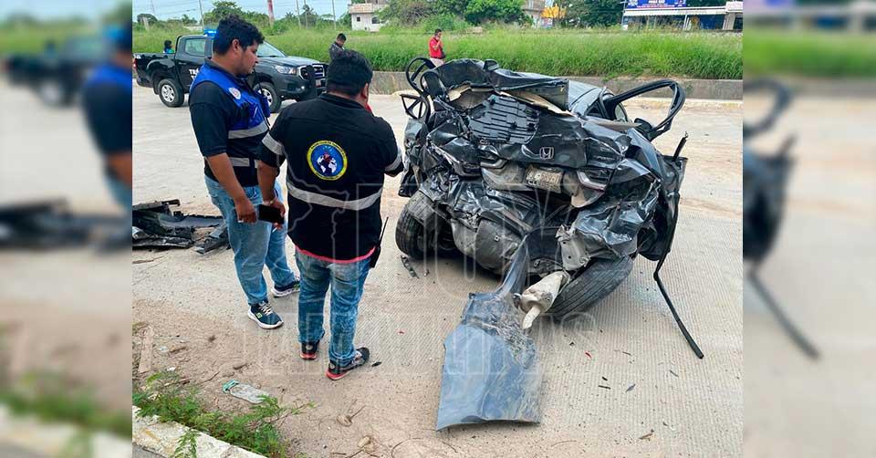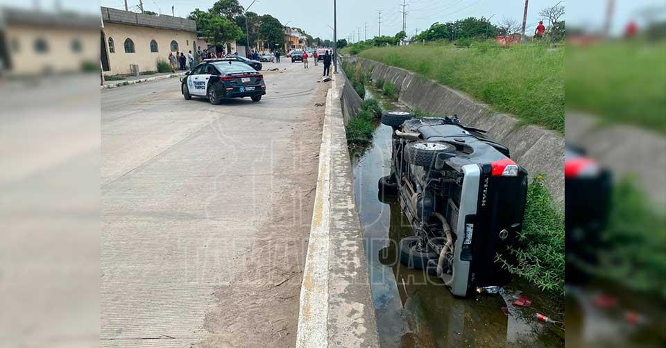 Camioneta Titán quedó en canal y auto hecho chatarra en choque y volcadura en Tampico