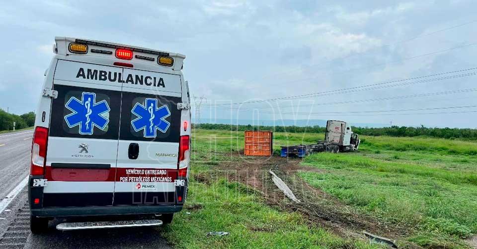 Ciudad Victoria, Tamaulipas. – Un tráiler articulado que transportaba un contenedor sufrió un accidente la mañana de este martes en la carretera Zaragoza–Victoria, a la altura del kilómetro 41, dejando como saldo daños materiales y una persona atendida por los cuerpos de emergencia.