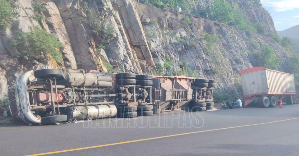 Ciudad Victoria, Tamaulipas. – A partir de las 08:00 horas fue cerrada la circulación en el tramo Juan Capitán–El Chihue de la carretera Rumbo Nuevo, debido a las maniobras para movilizar un tractocamión doble articulado cargado con 70 toneladas de sorgo que se volcó durante la madrugada.
