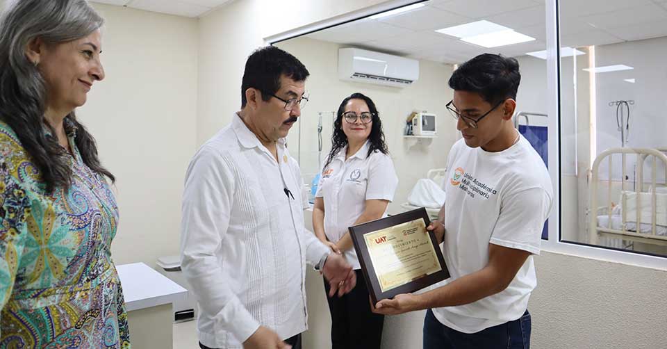 En otra parte de su visita, convivió con estudiantes de la unidad académica, quienes le entregaron un reconocimiento como padrino de las generaciones 2025 de las licenciaturas en Enfermería, Seguridad, Salud y Medio Ambiente y Psicología, así como de la generación 2024 de las maestrías en Enfermería y Psicología Clínica y Educativa.