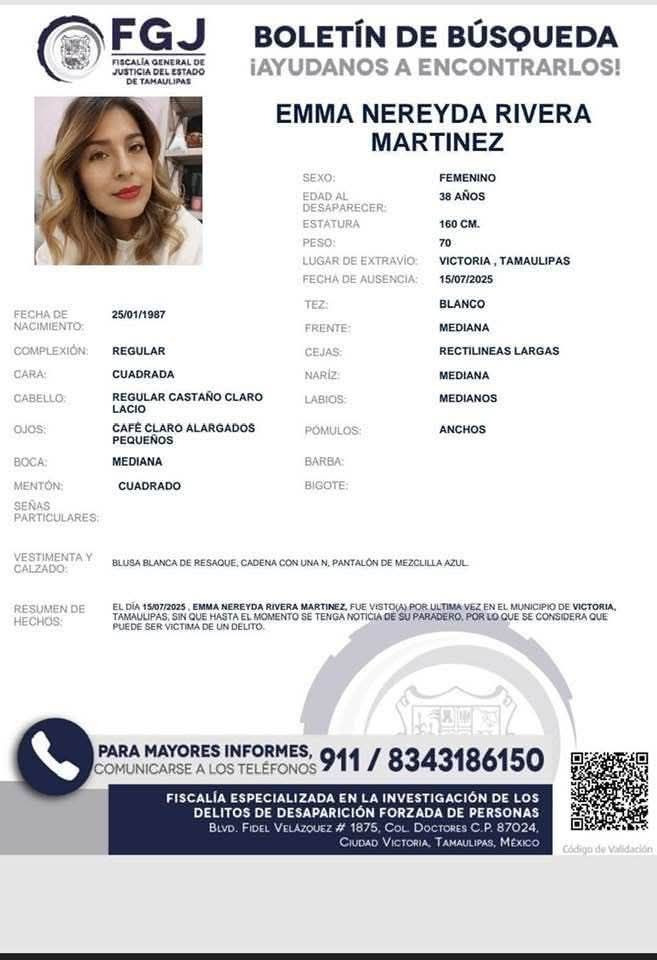 Ciudad Victoria, Tamaulipas. - La Fiscalía General de Justicia de Tamaulipas emitió un boletín de búsqueda para localizar a Emma Nereyda Rivera Martínez, quien fue vista por última vez el pasado 15 de julio de 2025 en Ciudad de Victoria.