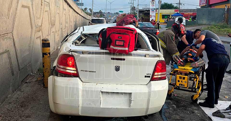 Nuevo Laredo, Tamaulipas. — Un hombre resultó con heridas de gravedad y fue trasladado de urgencia a un hospital, luego de que el automóvil en el que viajaba volcara desde lo alto del puente vehicular de la Calzada de Los Héroes en Nuevo Laredo.