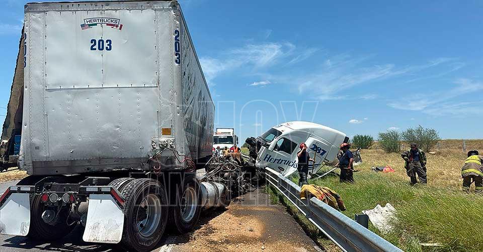 Nuevo Laredo, Tamaulipas. — Un tráiler de la línea Hertrucks se impactó contra el barandal de contención en la carretera libre Monterrey-Nuevo Laredo, luego de que su operador perdió el control por razones desconocidas.