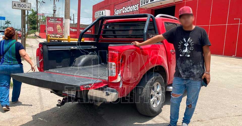 De acuerdo al reporte proporcionado por personal de tránsito, el conductor de la camioneta doble cabina tipo pick-up color rojo se desplazaba por el carril izquierdo rumbo al centro de Altamira, y en forma repentina el conductor viró a su derecha para ingresar al área de estacionamiento de una tienda de colchones.