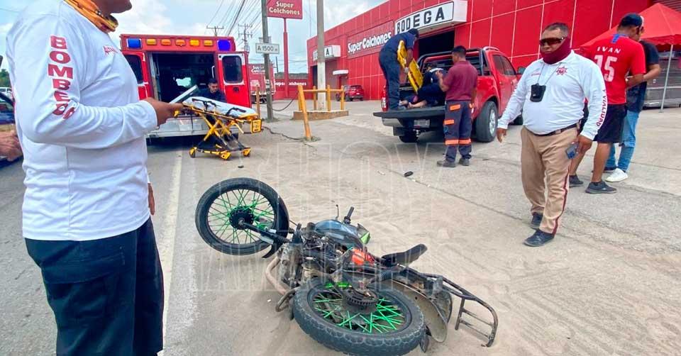 Altamira, Tamaulipas.-Una pareja que viajaba en motocicleta resultó con algunas lesiones, al impactarse en la caja de una camioneta, cuyo conductor en forma imprudente invadió la circulación al intentar ingresar al estacionamiento de una tienda de colchones.