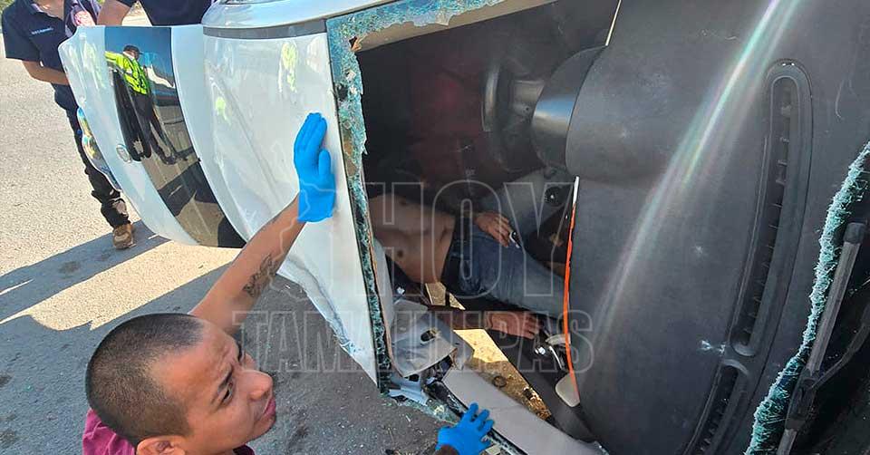 El fuerte golpe provocó que el vehículo volcara sobre su costado derecho, dejando al conductor atrapado en el interior y en condiciones críticas de salud.