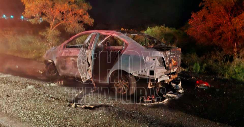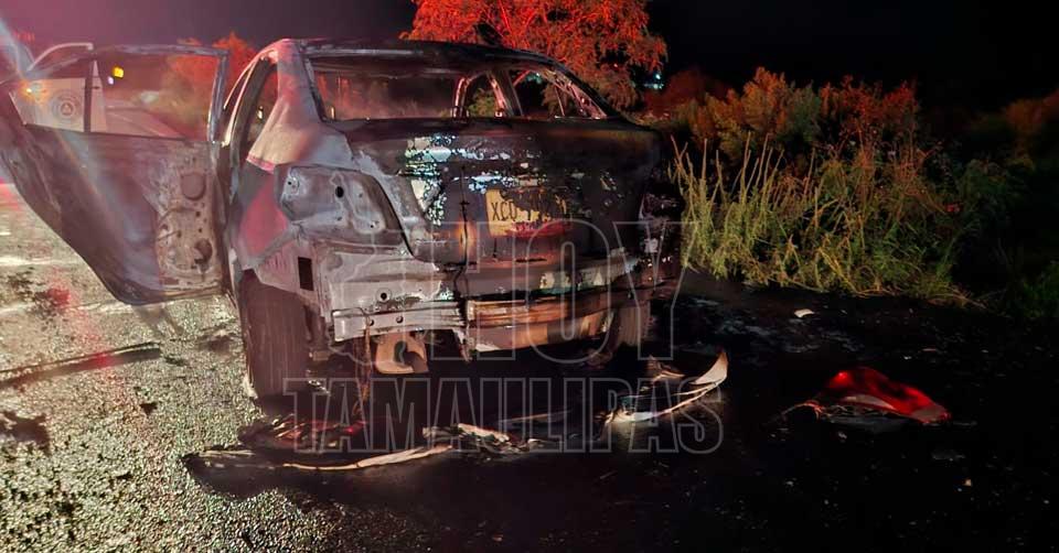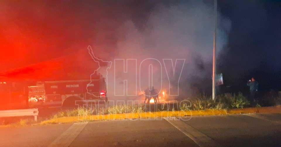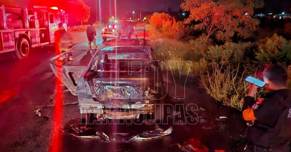 Ciudad Victoria, Tamaulipas. — Un vehículo fue consumido por el fuego la noche del miércoles tras sufrir un aparente corto circuito, mientras circulaba por el Libramiento Naciones Unidas, a la altura del fraccionamiento Arboladas. Una pareja que viajaba a bordo logró salir a tiempo y resultó ilesa.