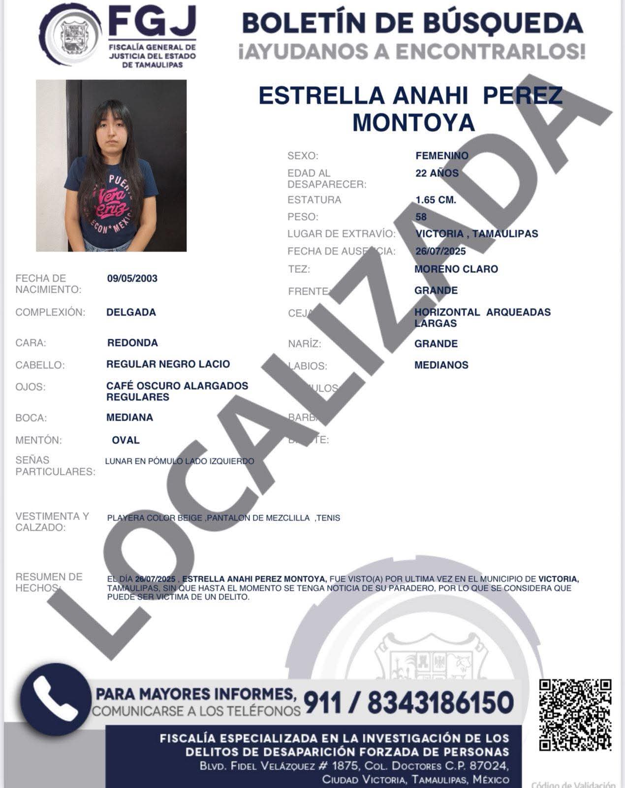 Ciudad Victoria, Tamaulipas. - La joven Estrella Anahí Pérez Montoya, quien había sido reportada como desaparecida el pasado 26 de julio en Ciudad Victoria, ya fue localizada con vida, informó la Vocería de Seguridad de Tamaulipas.