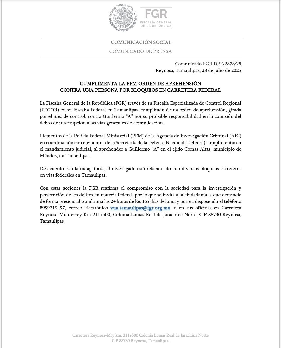 De acuerdo con información oficial, la solicitud judicial fue tramitada electrónicamente el 26 de julio a las 18:16 horas mediante el Sistema Integral de Seguimiento de Expedientes (SISE) y fue ejecutada en flagrancia este lunes. El detenido fue trasladado a las instalaciones de la FGR en Reynosa, donde permanece en espera de ser presentado ante un juez de control.