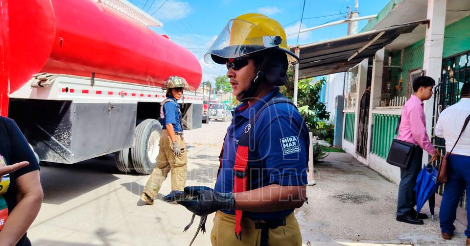 Ciudad Madero, Tamaulipas. - Integrantes de una familia en Ciudad Madero amanecieron con una sorpresa en el patio de su vivienda, al encontrar una cría de cocodrilo de regular tamaño que fue asegurada por elementos del cuerpo de bomberos.