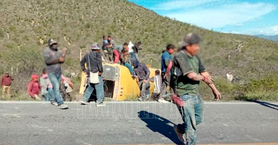 Tula, Tamaulipas. – Un camión que transportaba a 18 jornaleros agrícolas volcó en el tramo carretero que conecta al Ejido Palomas, en Ciudad del Maíz, con el municipio de Tula, dejando como saldo varias personas lesionadas, entre ellas un menor de edad.