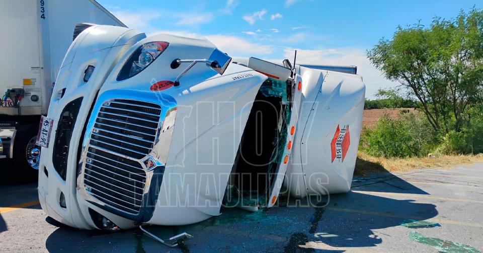 Reynosa, Tamaulipas. –Un tractocamión volcó esta mañana en el tramo elevado conocido como “El Caracol”, en el libramiento Sur II, a la altura del kilómetro 20, frente al Ejido El Porvenir en Reynosa.