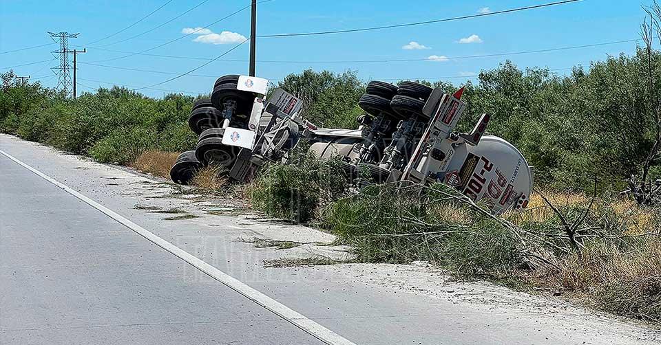 Nuevo Laredo, Tamaulipas. — Una de dos pipas cargadas con más de 33 mil litros de combustible sufrió una volcadura en el Libramiento Mex 2 de Nuevo Laredo, a la altura del kilómetro 16, luego de desengancharse del tráiler que la transportaba.