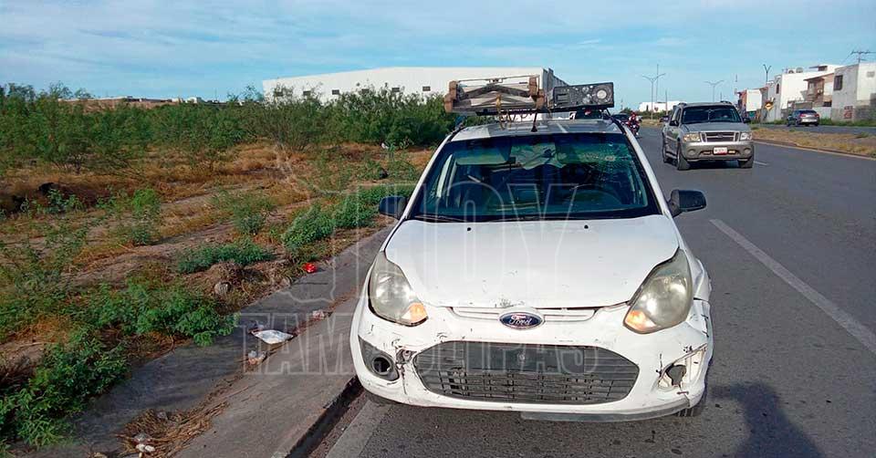 Nuevo Laredo, Tamaulipas.- Una camioneta Kia Soul modelo 2023 terminó fuera de la vía, entre el monte, luego de ser impactada lateralmente por un automóvil cuyo conductor se salió de su carril en el Bulevar Municipio Libre de Nuevo Laredo.