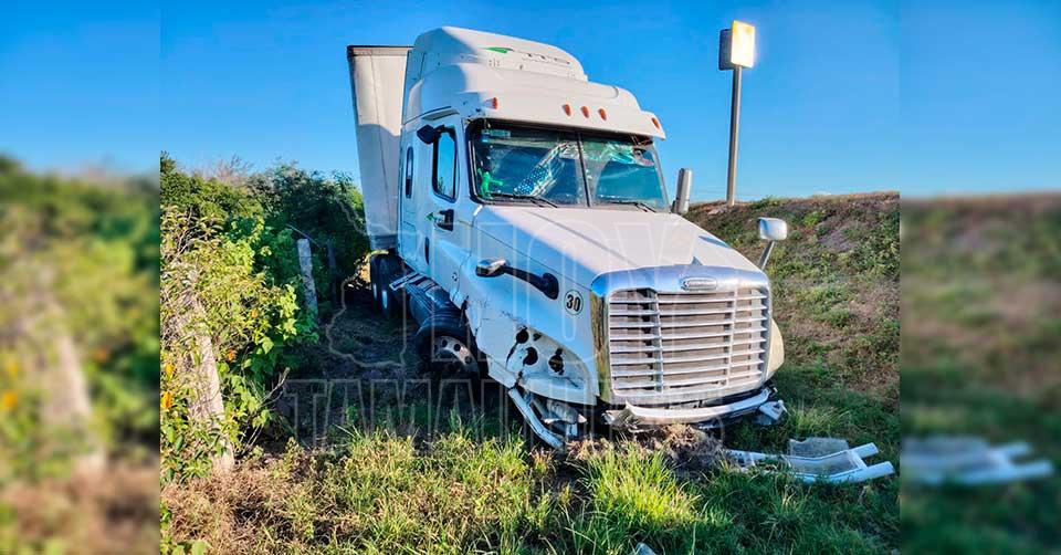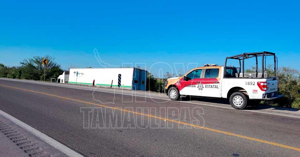 González, Tamaulipas. - Como parte de las labores de vigilancia en las vías de comunicación de Tamaulipas, elementos de la Guardia Estatal de Apoyo Carretero, comisionados a la Estación Segura Villa Manuel, acudieron al kilómetro 3 de la Carretera Federal 80, tramo Manuel-González, luego del derrape de un tractocamión.