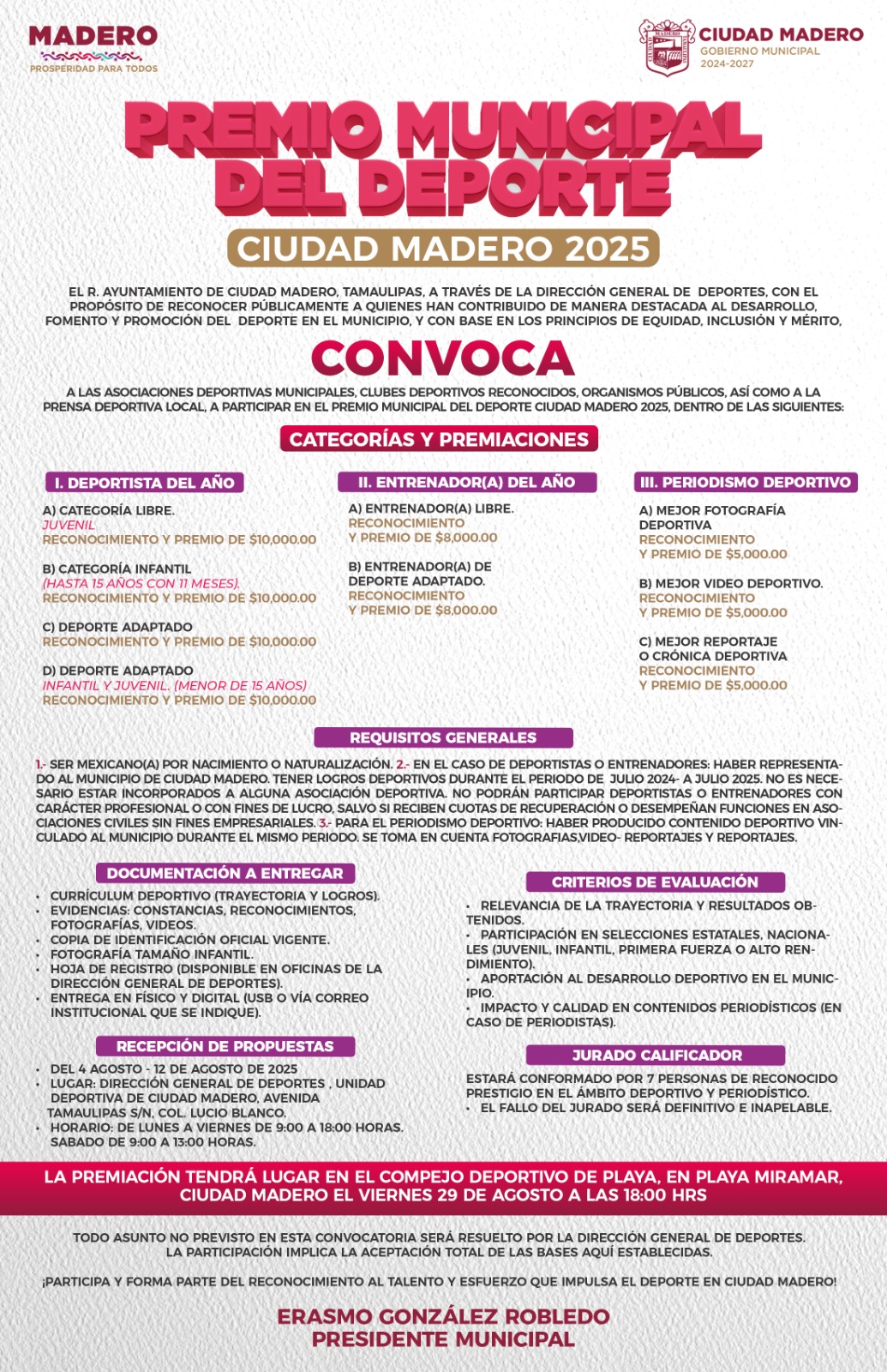Ciudad Madero, Tamaulipas.-Con el propósito de rendir un amplio reconocimiento a los deportistas más destacados en su actividad durante el actual gobierno municipal, se ha lanzado la convocatoria para otorgar los premios según las categorías; además a los periodistas más destacados por sus crónicas y lo más destacado en su difusión del deporte.