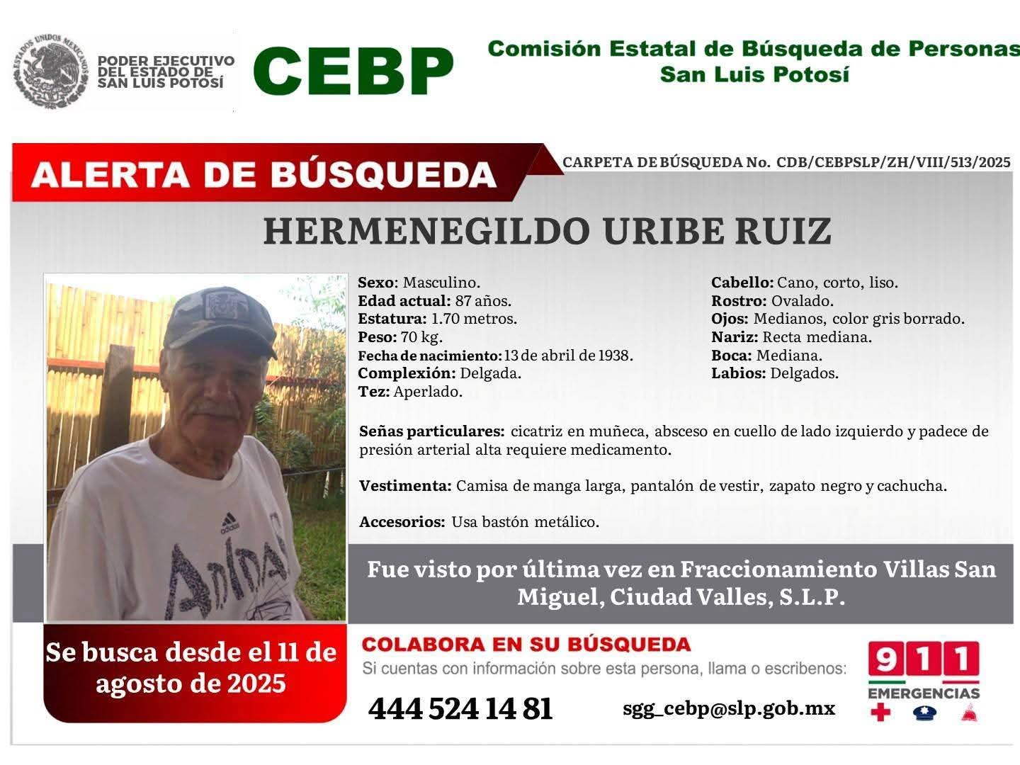 Más tarde, una familia de Ciudad Valles, San Luis Potosí, alertó en redes sociales que el hombre podría ser Hermenegildo Uribe Ruiz, de 87 años, desaparecido desde el 11 de agosto en el fraccionamiento Villas San Miguel. La ficha de búsqueda se viralizó entre usuarios de la región.