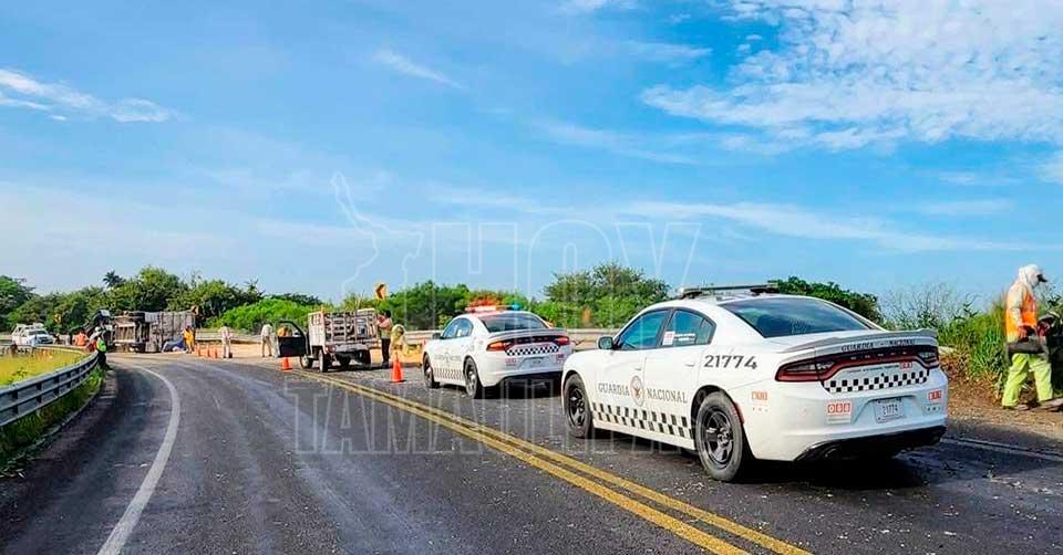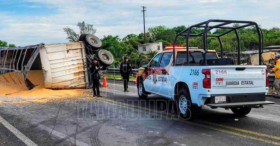 Caos vial en Libramiento de Tampico por volcadura de remolque que transportaba maíz