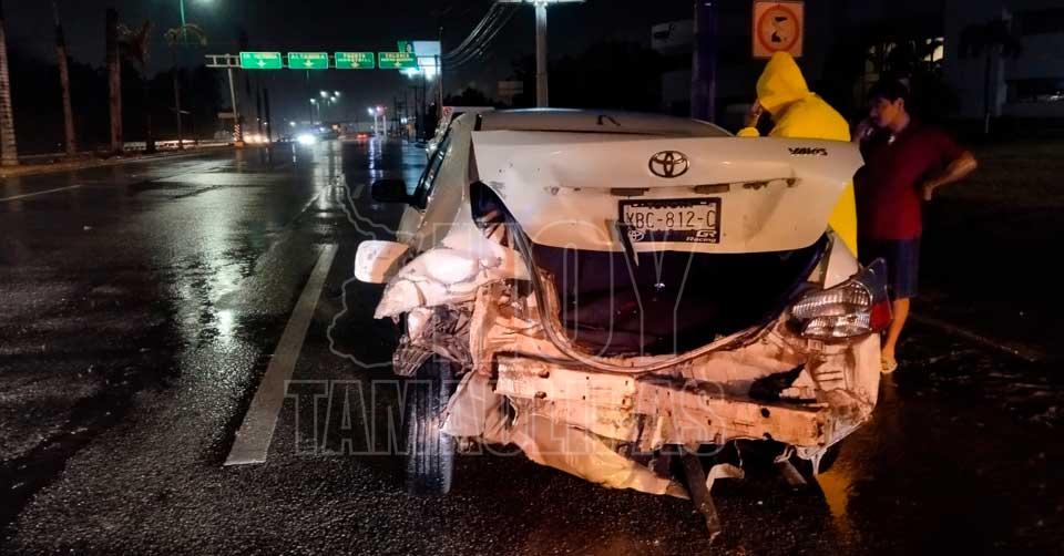 El exceso de velocidad, lo mojado del pavimento y el no tomar las debidas precauciones ocasionaron que se estrellara en la parte trasera del carro Toyota Yaris color blanco modelo 2003 también con placas de Tamaulipas, que tripulaba el señor Andrés N de 64 años de edad, terminando sobre el camellón el carro Sentra, sin que por fortuna se reportaran personas lesionadas.
