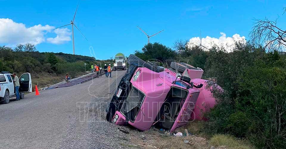 De acuerdo con los primeros reportes, el accidente ocurrió cuando la operadora intentó orillarse, lo que ocasionó que la pesada carga perdiera estabilidad, provocando la volcadura de la unidad a un costado de la vía, donde se realizan trabajos de construcción.