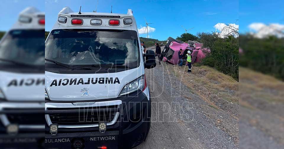 Villa de Casas, Tamaulipas. - Un camión revolvedor de material volcó esta tarde a la altura del kilómetro 38 de la carretera Villa de Casas–Ciudad Victoria, cerca de la brecha que conduce al Rancho Loma Prieta.