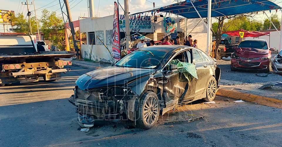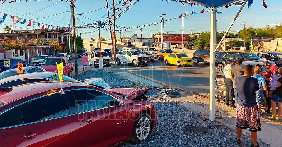 Nuevo Laredo, Tamaulipas. — Una joven de 18 años y su acompañante salieron ilesos de milagro tras protagonizar un aparatoso accidente que involucró a tres vehículos estacionados en un lote ubicado en la Carretera Anáhuac, a un costado del Puente Mazatlán, en Nuevo Laredo.