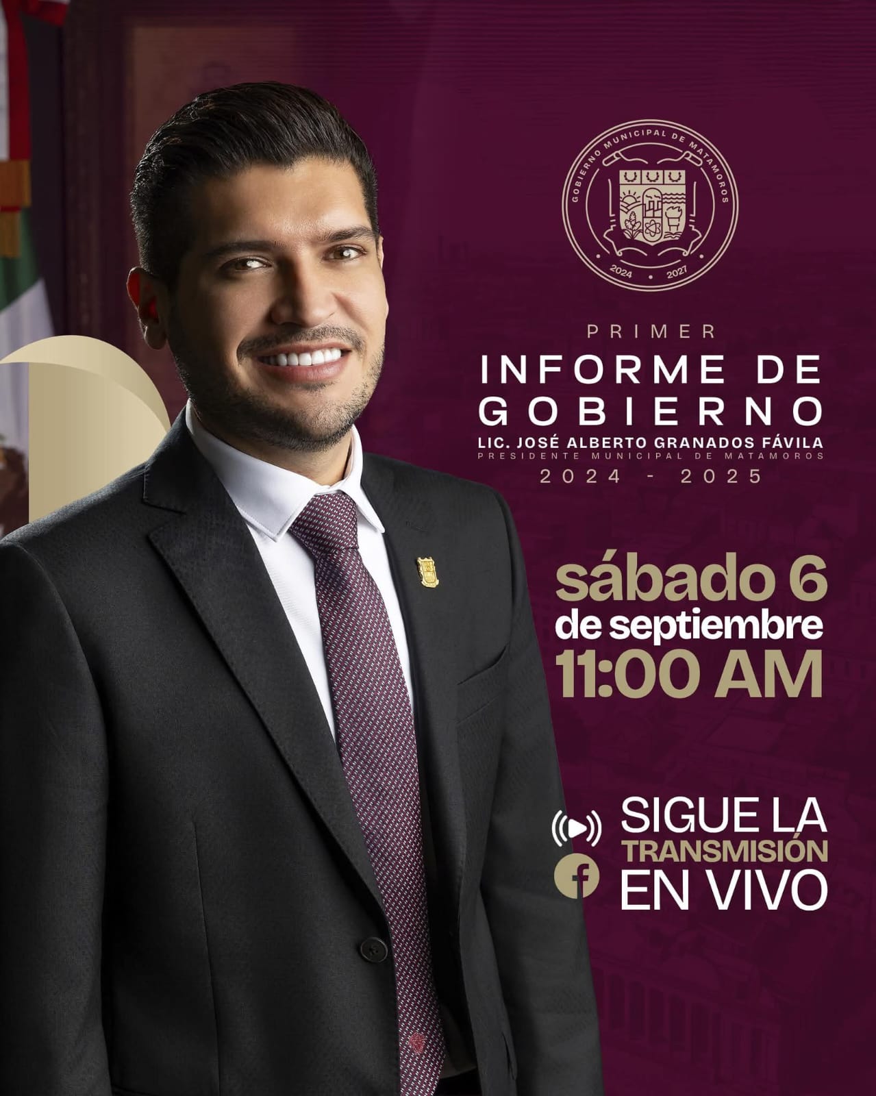 Matamoros, Tamaulipas. - Este sábado 6 de septiembre, en punto de las 11:00 de la mañana, el Presidente Municipal de Matamoros, Beto Granados, llevará a cabo la presentación de su Primer Informe de Gobierno, acto que representa un importante ejercicio de transparencia y rendición de cuentas ante la ciudadanía.