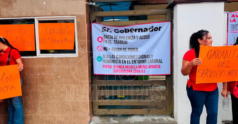 Ciudad Victoria, Tamaulipas. - Personal docente y administrativo de los jardines de niños adheridos a la Supervisión 63, entre ellos el Jardín de Niños ABC de Ciudad Victoria, realizaron esta mañana una manifestación y un parcial cierre de labores, exigiendo que la Secretaría de Educación de Tamaulipas dé respuesta a sus demandas.