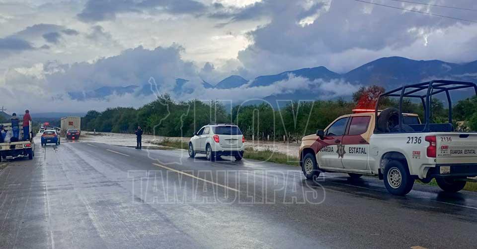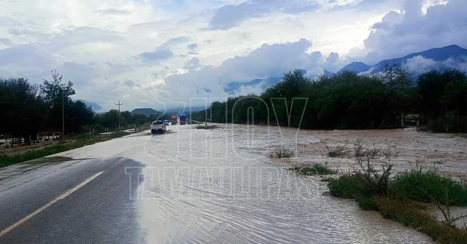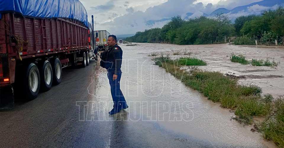 Tula, Tamaulipas. - El desbordamiento de un arroyo en el kilómetro 56 de la Carretera Federal 101, a la altura del Ejido Congregación Jaimez, provocó la suspensión de la circulación en ambos sentidos.