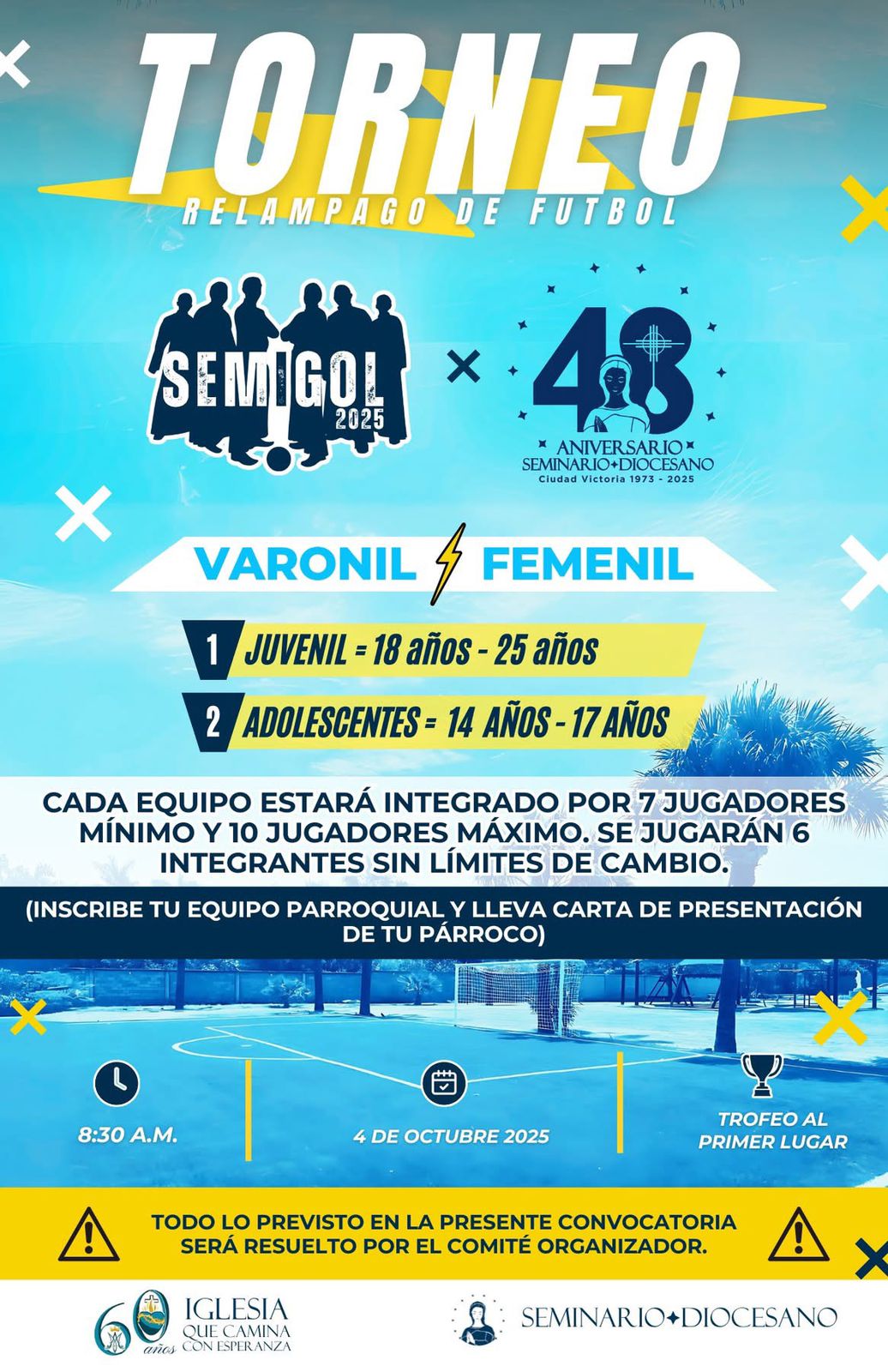 Ciudad Victoria, Tamaulipas.- Como parte de las actividades por el 48 aniversario del Seminario Diocesano de Victoria, se llevará a cabo un torneo relámpago de fútbol denominado “Semi-Gol”, el cual busca fomentar la sana convivencia y la participación de familias y jóvenes de todas las edades.