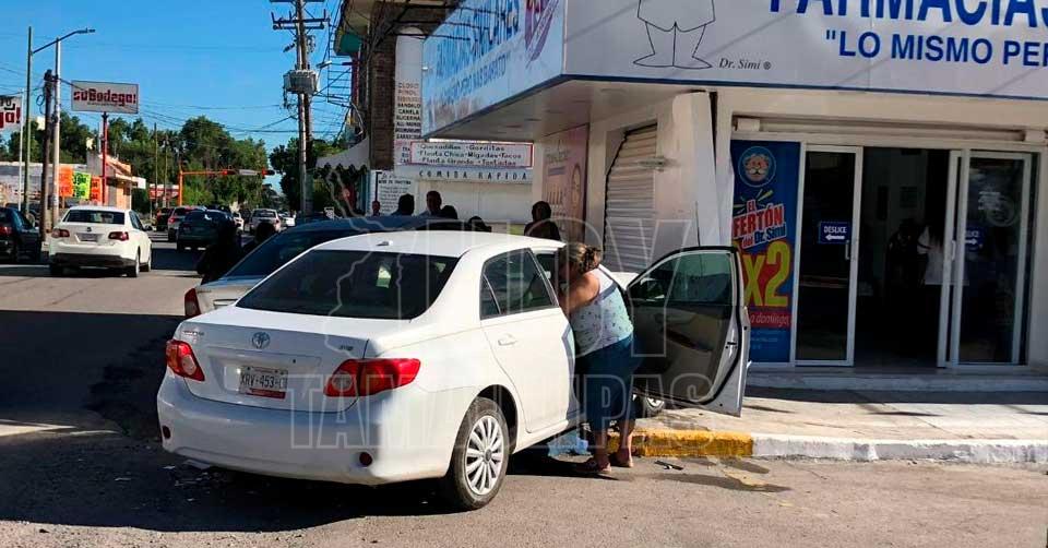 A consecuencia del impacto, ambos vehículos se proyectaron contra la fachada de una sucursal de Farmacias Similares, terminando sobre la banqueta.
