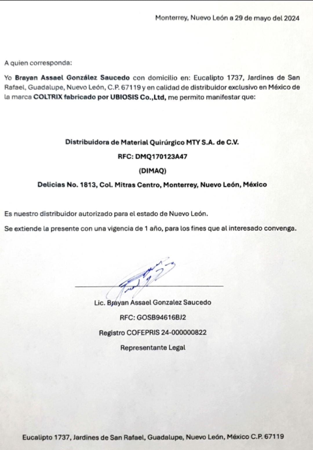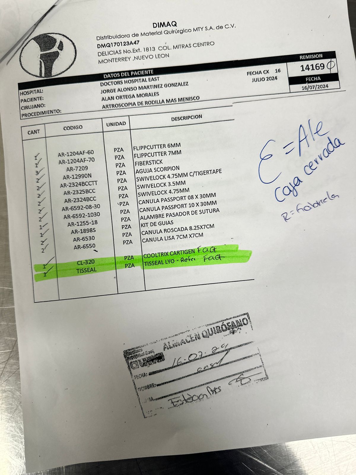Otro caso se registró el 25 de octubre de 2024, en una cirugía a la paciente María de Lourdes Villalobos Garza. Aunque se utilizó el producto Cooltrix Cartigen, el distribuidor oficial negó haber vendido el insumo a Dimaq. Además, la carta de distribución presentada al hospital contenía un número de registro sanitario presuntamente falso, lo que sugiere falsificación de documentos y canales de abasto irregulares.