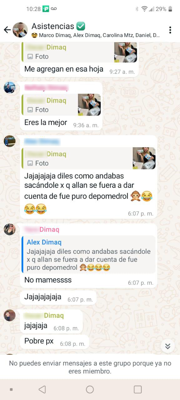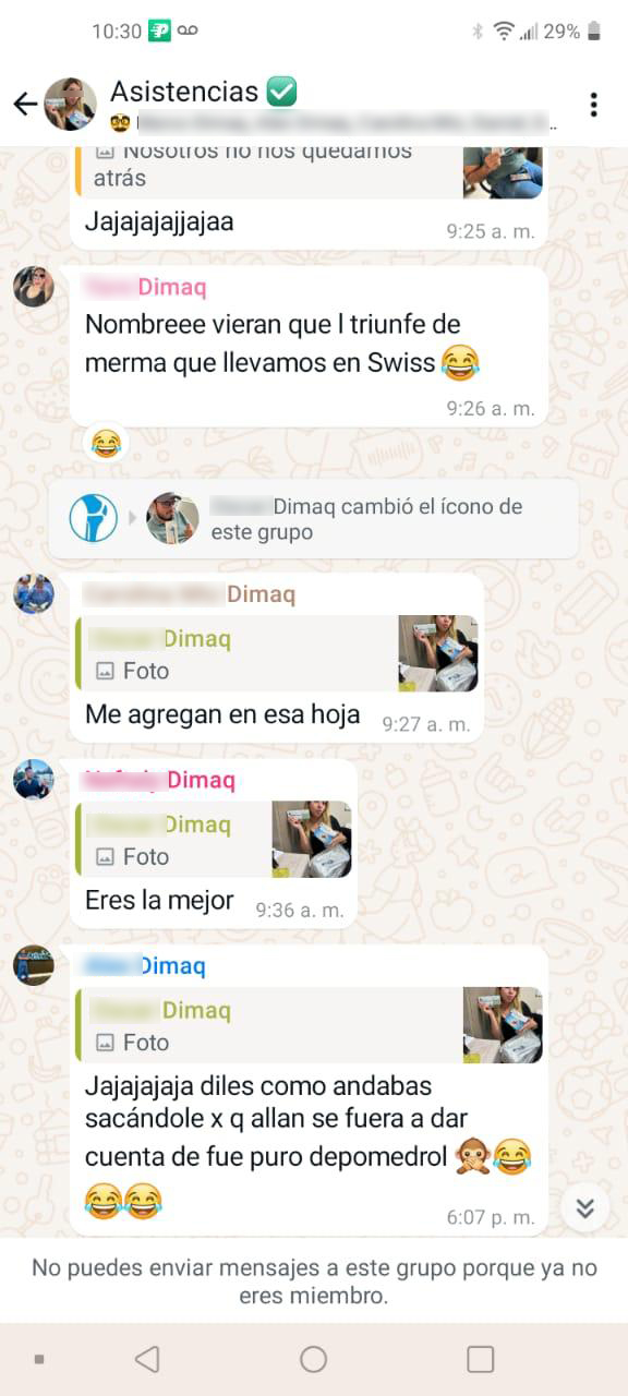 La investigación también revela conversaciones internas atribuidas a empleados de Dimaq, donde se hacen comentarios en tono de burla sobre la sustitución de insumos y la presunta extracción de materiales de otros hospitales. Estos mensajes refuerzan la hipótesis de una red de operaciones fraudulentas con mayor alcance.