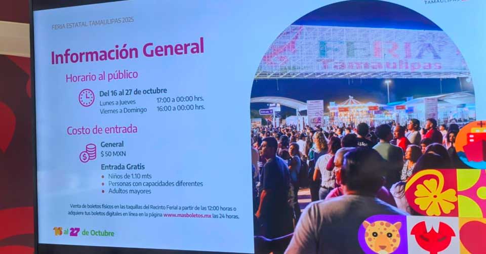 Ciudad Victoria, Tamaulipas. - La Secretaría de Desarrollo Económico de Tamaulipas reveló los detalles de la esperada Feria Tamaulipas 2025, que se llevará a cabo del 16 al 27 de octubre. El costo de entrada será de 50 pesos, con acceso gratuito para niños menores de 1.10 metros de altura, personas con discapacidad y adultos mayores. Además, se ofrecerán recorridos gratuitos a planteles escolares.