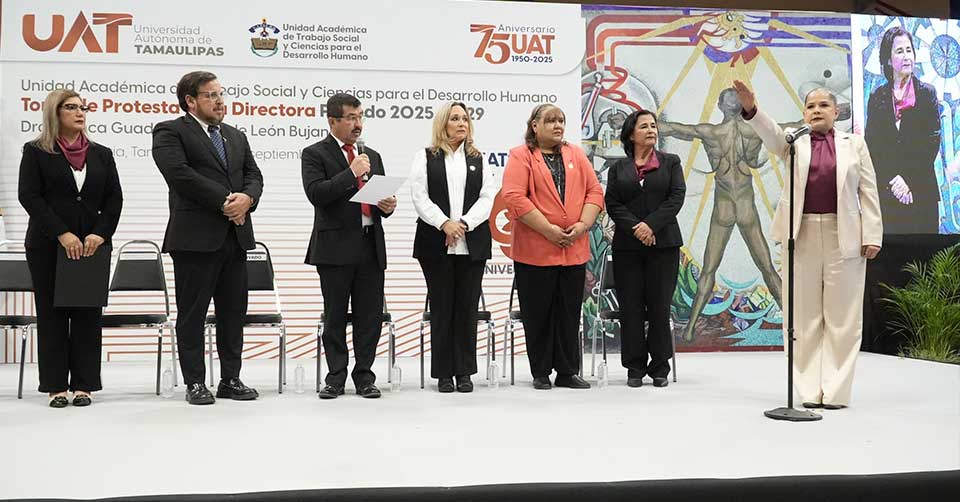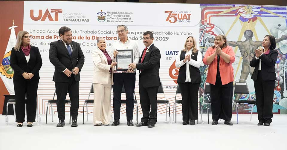 Ciudad Victoria, Tamaulipas. - Teniendo como testigo de honor al gobernador Américo Villarreal Anaya, el rector de la Universidad Autónoma de Tamaulipas (UAT), Dámaso Anaya Alvarado, le tomó protesta a la nueva directora de la Unidad Académica de Trabajo Social y Ciencias para el Desarrollo Humano (UATSCDH), Dra. Blanca Guadalupe Cid de León Bujanos, quien asume el cargo para el periodo 2025-2029.